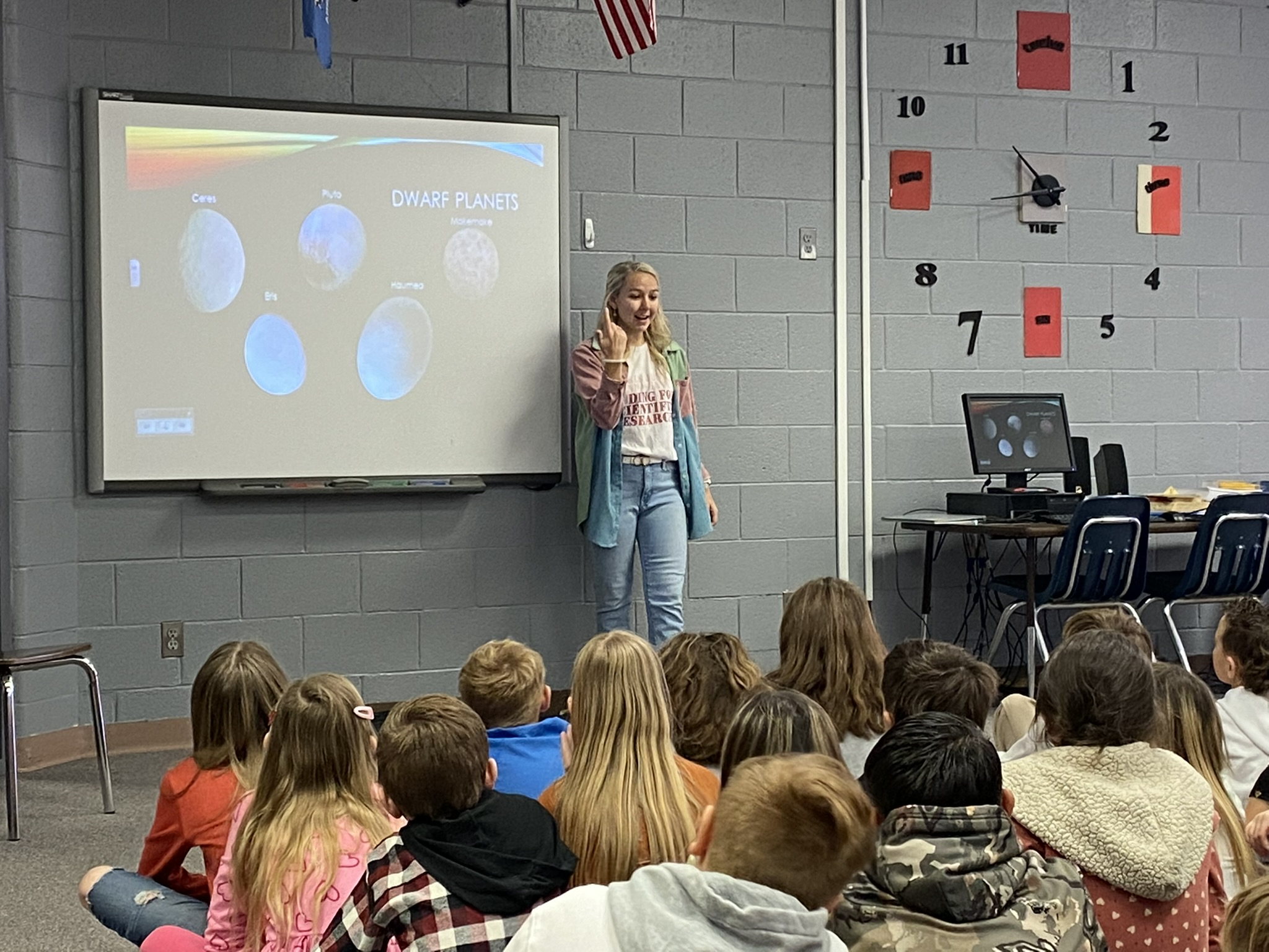 Prague 2014 graduate Racine Cleveland visiting with the Prague Elementary 3rd grade classes last week. She talked to the students about planets in our solar system and how their orbits work. Racine is currently a Space and Planetary Science PhD student at the University of Arkansas. She does research funded by a grant that her science team were awards by NASA. (Submitted by Mrs. Nichole Bailey) - Prague (Oklahoma) Times New Herald February 2022
